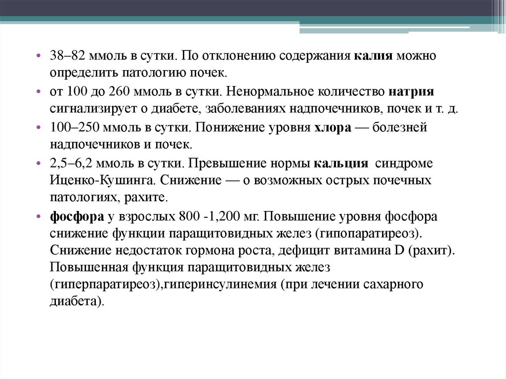 • 38–82 ммоль в сутки. По отклонению содержания калия можноопределить патологию почек.