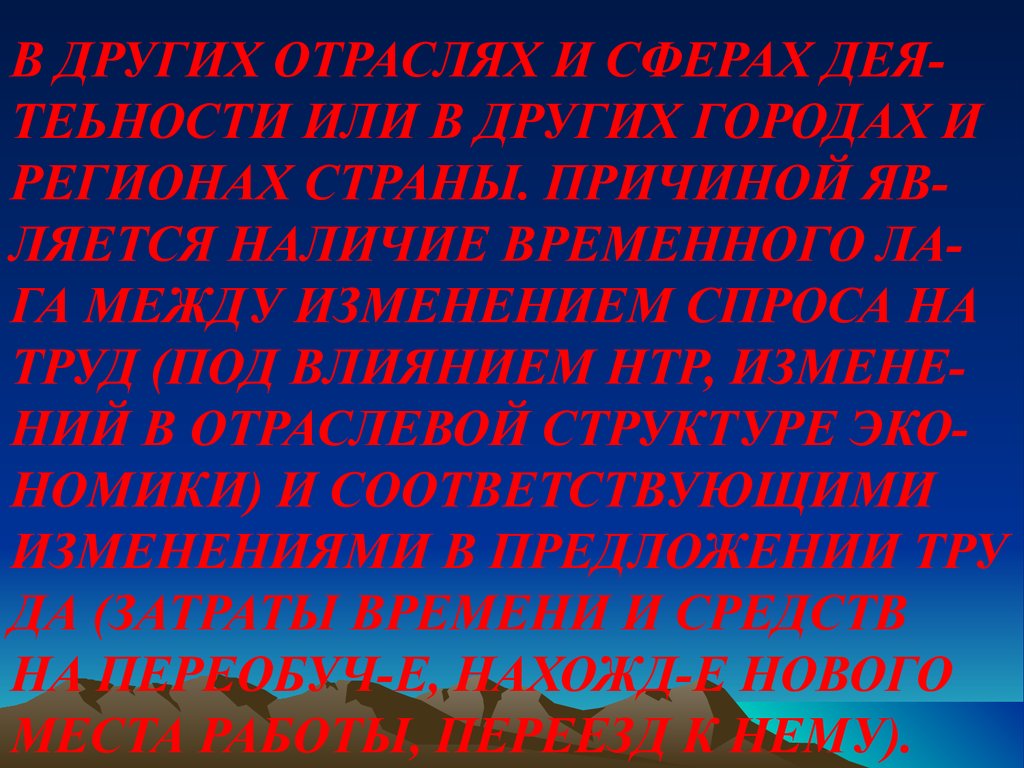 В ДРУГИХ ОТРАСЛЯХ И СФЕРАХ ДЕЯТЕЬНОСТИ ИЛИ В ДРУГИХ ГОРОДАХ ИРЕГИОНАХ СТРАНЫ. ПРИЧИНОЙ ЯВЛЯЕТСЯ НАЛИЧИЕ ВРЕМЕННОГО ЛАГА МЕЖДУ ИЗМЕНЕНИЕМ СПРОСА НА