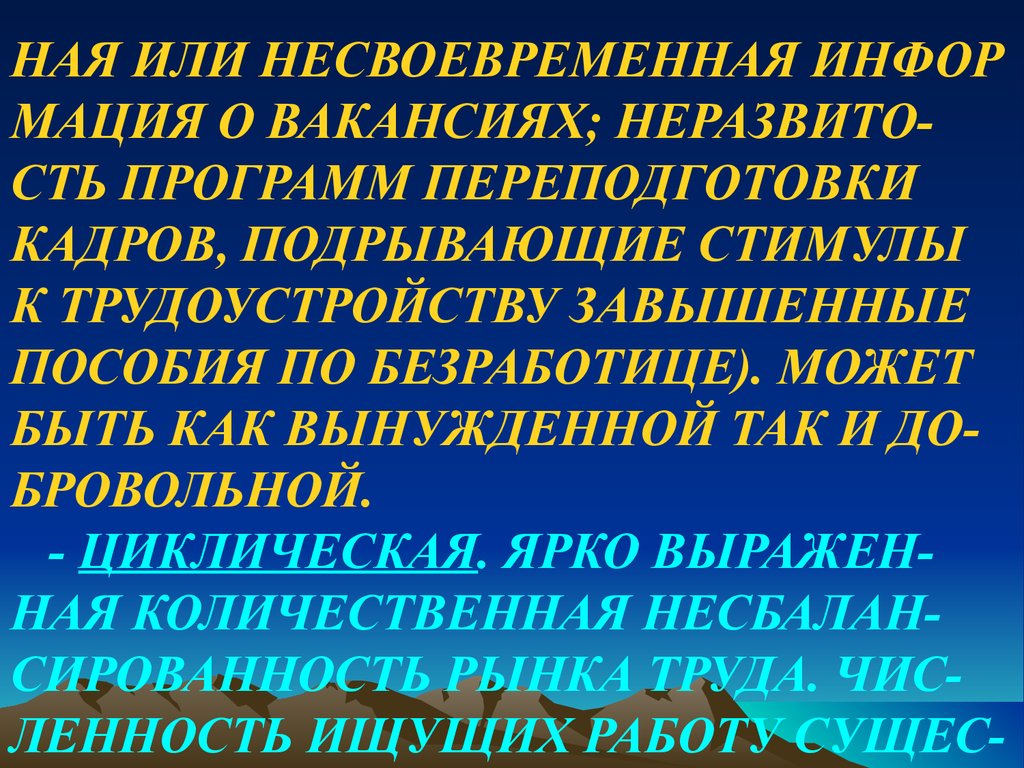 - ЦИКЛИЧЕСКАЯ. ЯРКО ВЫРАЖЕННАЯ КОЛИЧЕСТВЕННАЯ НЕСБАЛАНСИРОВАННОСТЬ РЫНКА ТРУДА. ЧИСЛЕННОСТЬ ИЩУЩИХ РАБОТУ СУЩЕС-