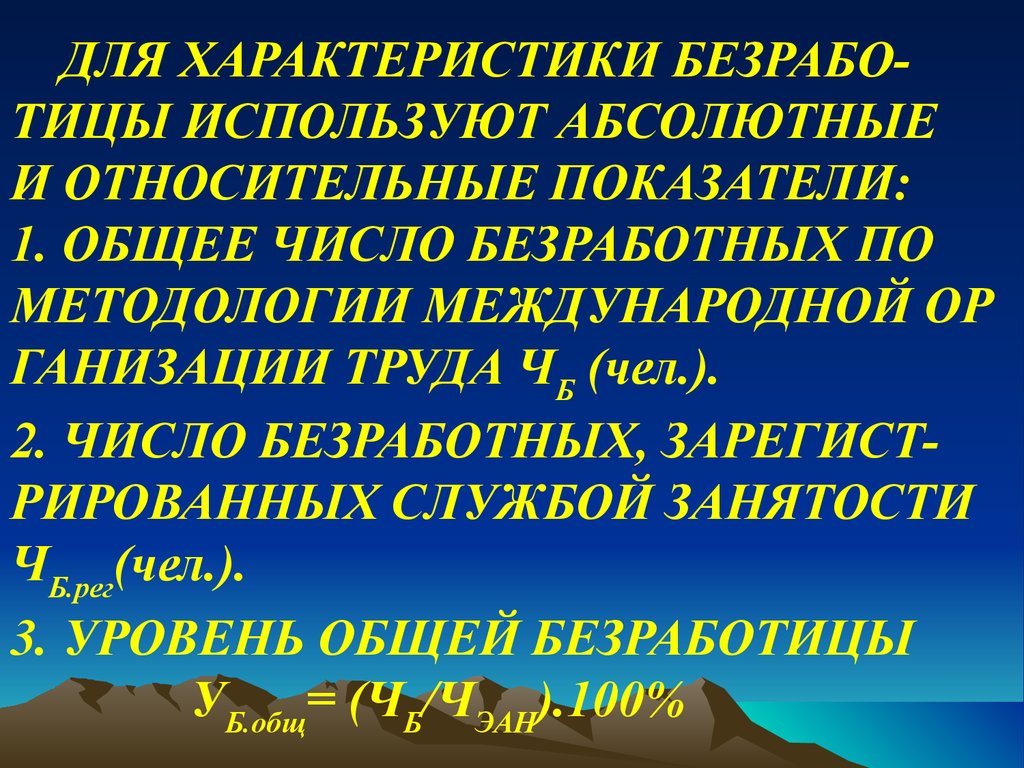 ДЛЯ ХАРАКТЕРИСТИКИ БЕЗРАБОТИЦЫ ИСПОЛЬЗУЮТ АБСОЛЮТНЫЕИ ОТНОСИТЕЛЬНЫЕ ПОКАЗАТЕЛИ: