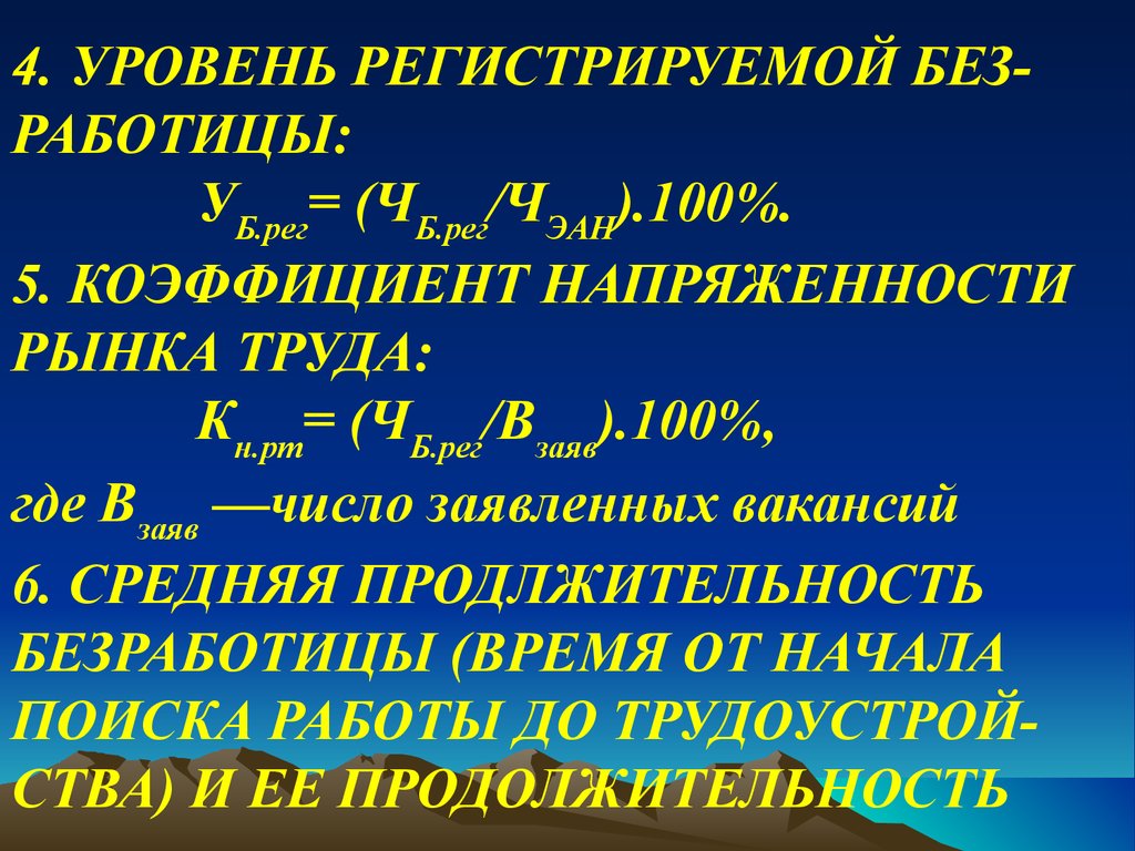 4. УРОВЕНЬ РЕГИСТРИРУЕМОЙ БЕЗРАБОТИЦЫ:УБ.рег= (ЧБ.рег/ЧЭАН).100%.