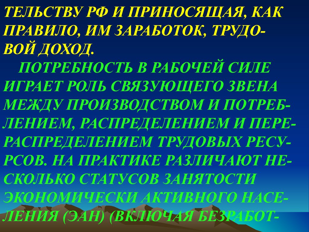 МЕЖДУ ПРОИЗВОДСТВОМ И ПОТРЕБЛЕНИЕМ, РАСПРЕДЕЛЕНИЕМ И ПЕРЕРАСПРЕДЕЛЕНИЕМ ТРУДОВЫХ РЕСУРСОВ. НА ПРАКТИКЕ РАЗЛИЧАЮТ НЕСКОЛЬКО СТАТУСОВ ЗАНЯТОСТИ