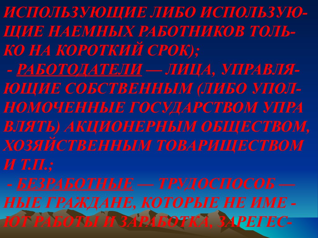 ИСПОЛЬЗУЮЩИЕ ЛИБО ИСПОЛЬЗУЮЩИЕ НАЕМНЫХ РАБОТНИКОВ ТОЛЬКО НА КОРОТКИЙ СРОК);- РАБОТОДАТЕЛИ — ЛИЦА, УПРАВЛЯЮЩИЕ СОБСТВЕННЫМ (ЛИБО УПОЛНОМОЧЕННЫЕ ГОСУДАРСТВОМ УПРА