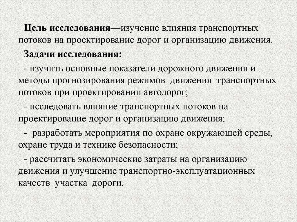 Цель исследования—изучение влияния транспортныхпотоков на проектирование дорог и организацию движения.