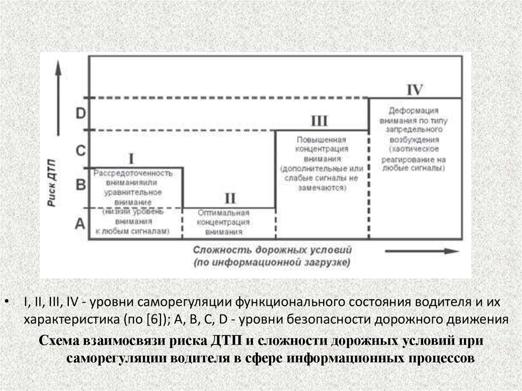 • I, II, III, IV - уровни саморегуляции функционального состояния водителя и иххарактеристика (по [6]); A, B, C, D - уровни безопасности дорожного движения