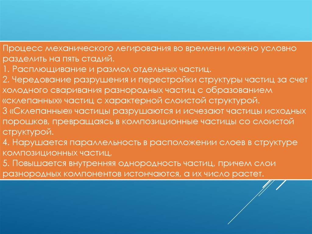 Процесс механического легирования во времени можно условноразделить на пять стадий.