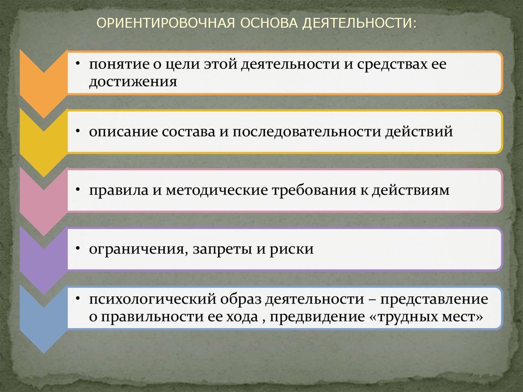 ОРИЕНТИРОВОЧНАЯ ОСНОВА ДЕЯТЕЛЬНОСТИ:• понятие о цели этой деятельности и средствах ее