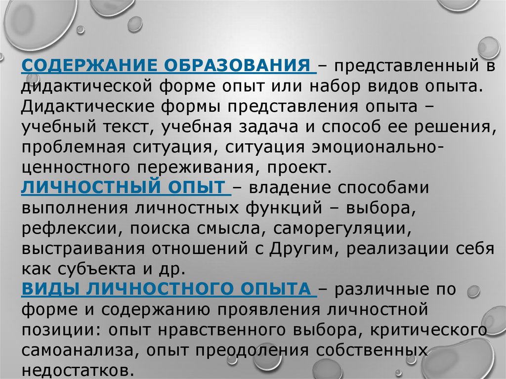 СОДЕРЖАНИЕ ОБРАЗОВАНИЯ – представленный вдидактической форме опыт или набор видов опыта.