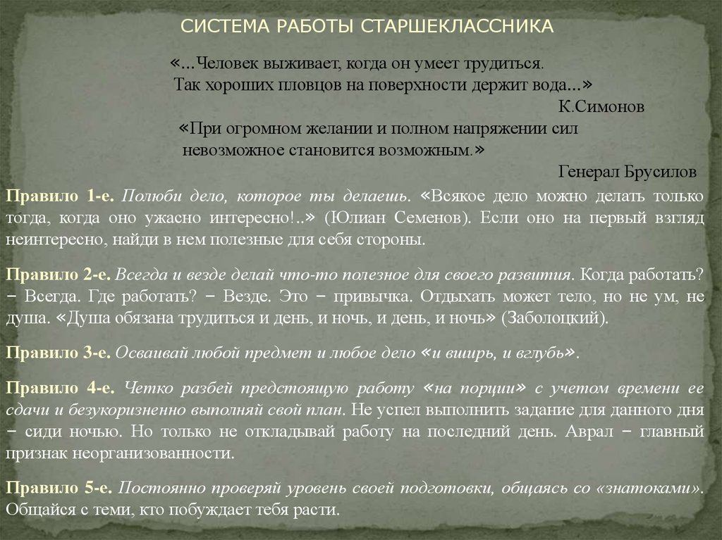 СИСТЕМА РАБОТЫ СТАРШЕКЛАССНИКА«…Человек выживает, когда он умеет трудиться.