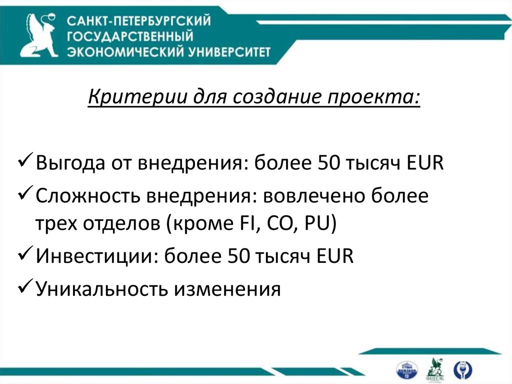 Критерии для создание проекта:Выгода от внедрения: более 50 тысяч EUR