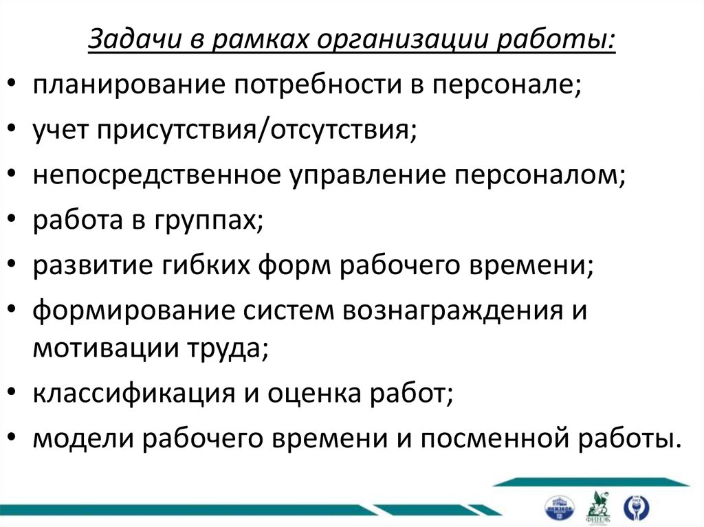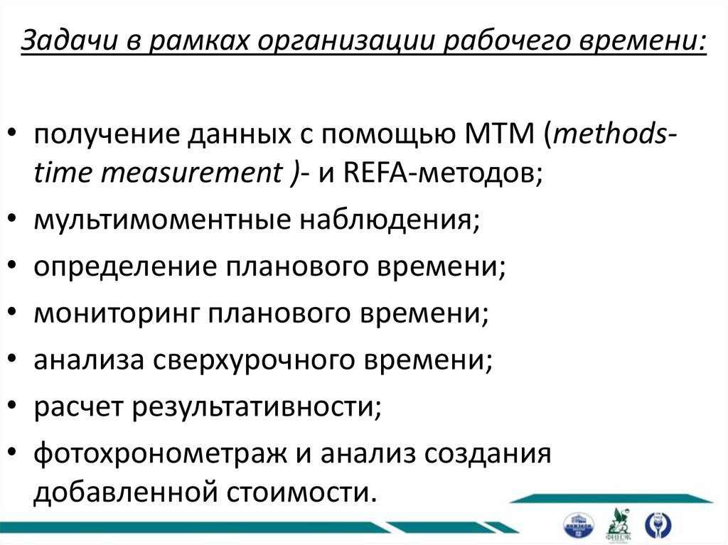 Задачи в рамках организации рабочего времени:• получение данных с помощью MTM (methodstime measurement )- и REFA-методов;