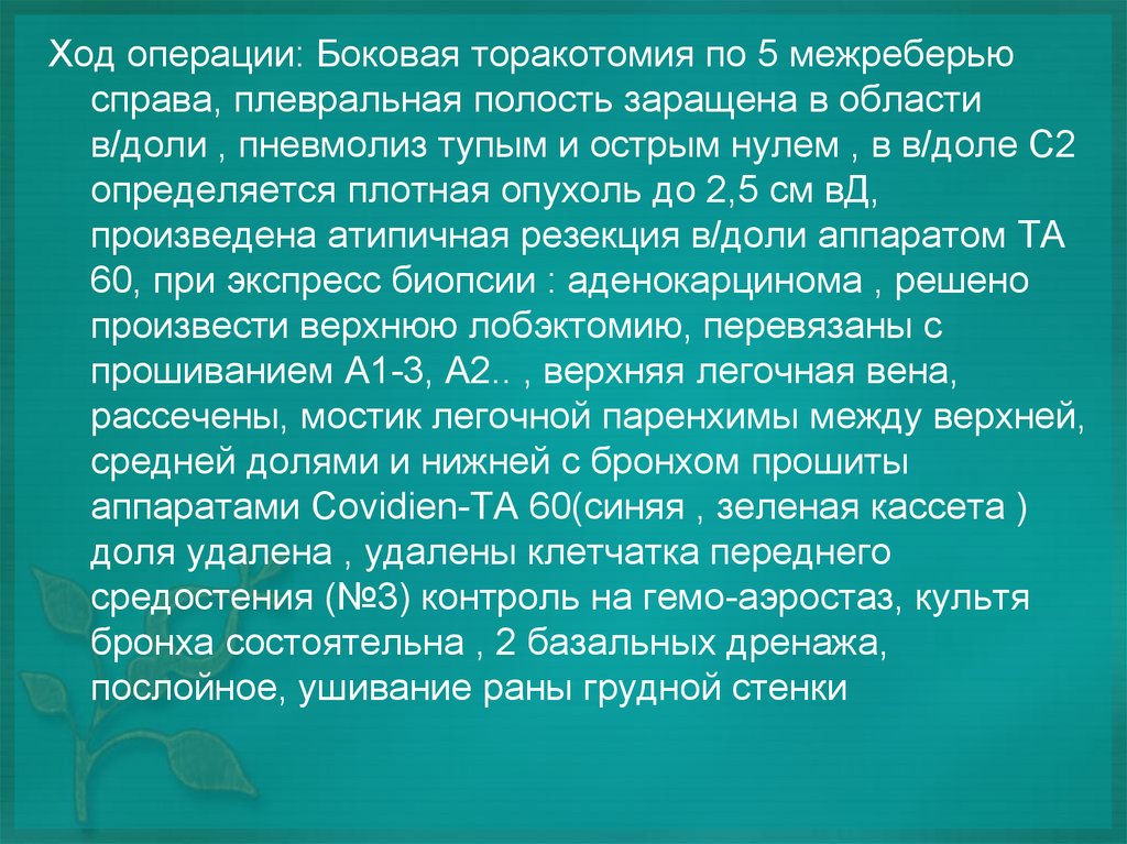 Ход операции: Боковая торакотомия по 5 межреберьюсправа, плевральная полость заращена в области