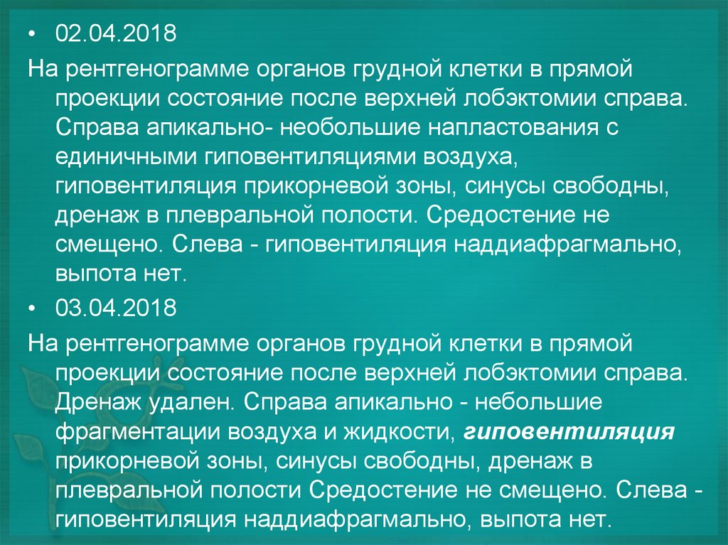 плевральной полости Средостение не смещено. Слева гиповентиляция наддиафрагмально, выпота нет.