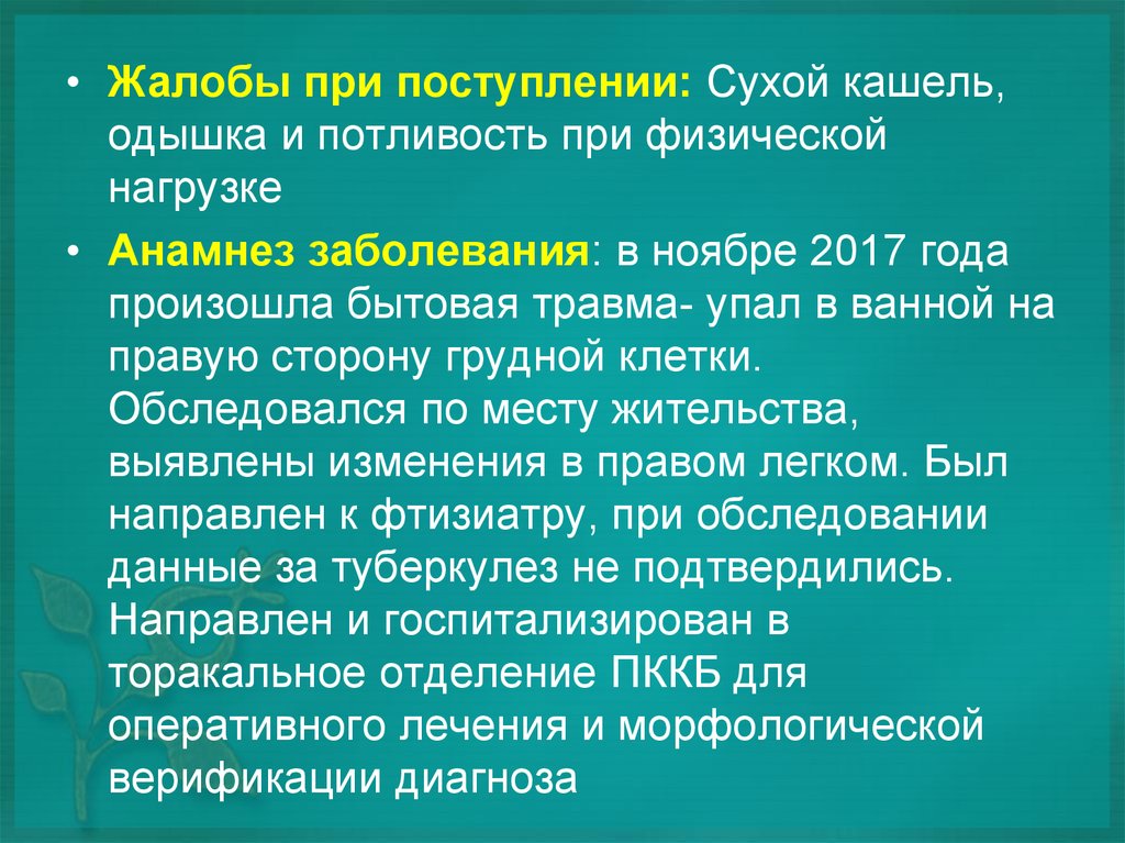 • Жалобы при поступлении: Сухой кашель,одышка и потливость при физической