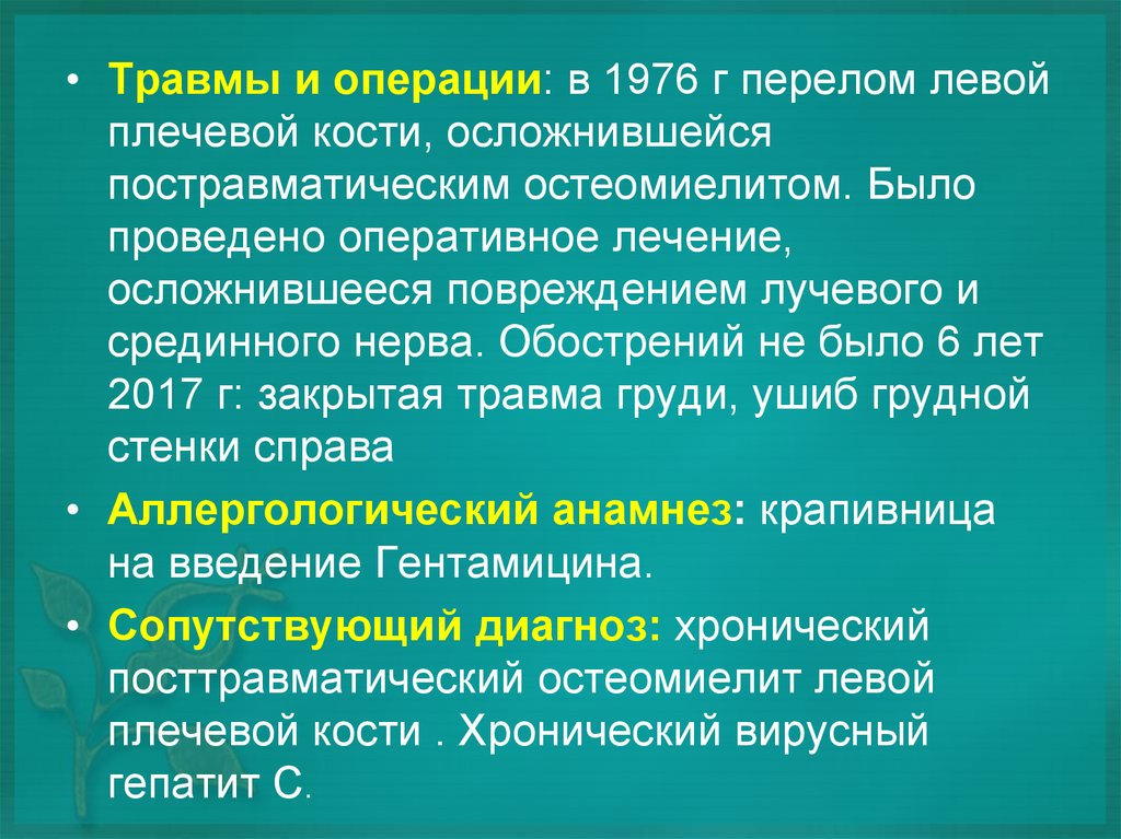 • Травмы и операции: в 1976 г перелом левойплечевой кости, осложнившейся