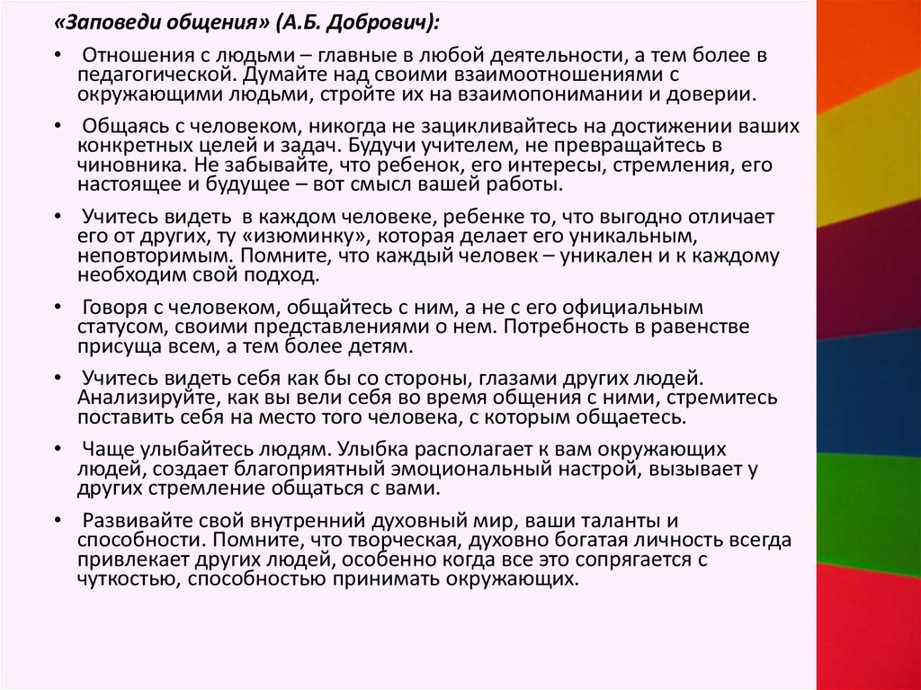 «Заповеди общения» (А.Б. Добрович):• Отношения с людьми – главные в любой деятельности, а тем более в