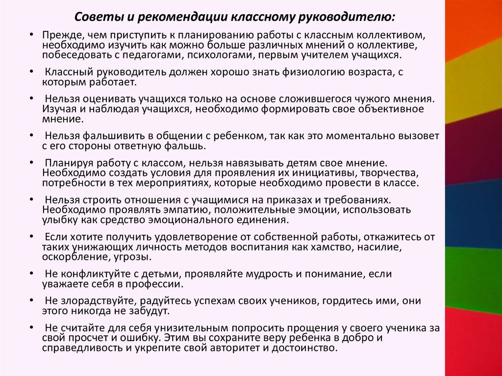 Советы и рекомендации классному руководителю:• Прежде, чем приступить к планированию работы с классным коллективом,