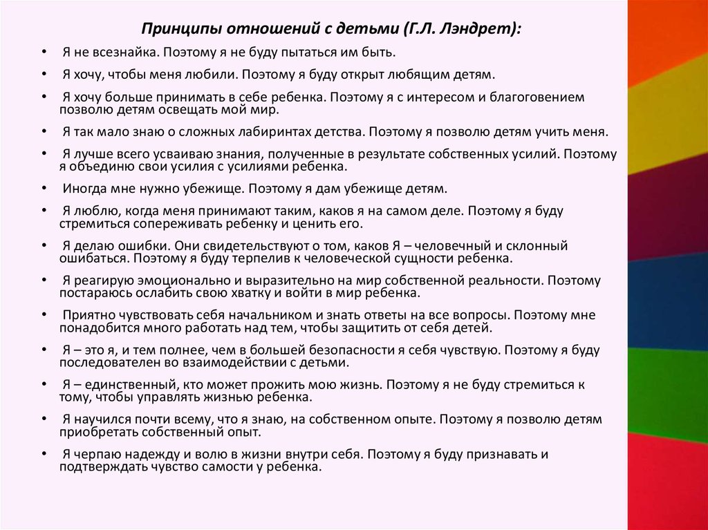 Принципы отношений с детьми (Г.Л. Лэндрет):Я не всезнайка. Поэтому я не буду пытаться им быть.