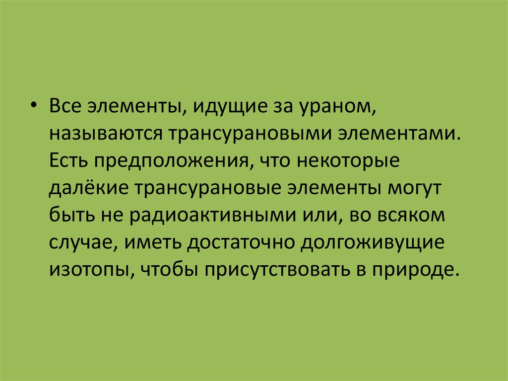 • Все элементы, идущие за ураном,называются трансурановыми элементами.