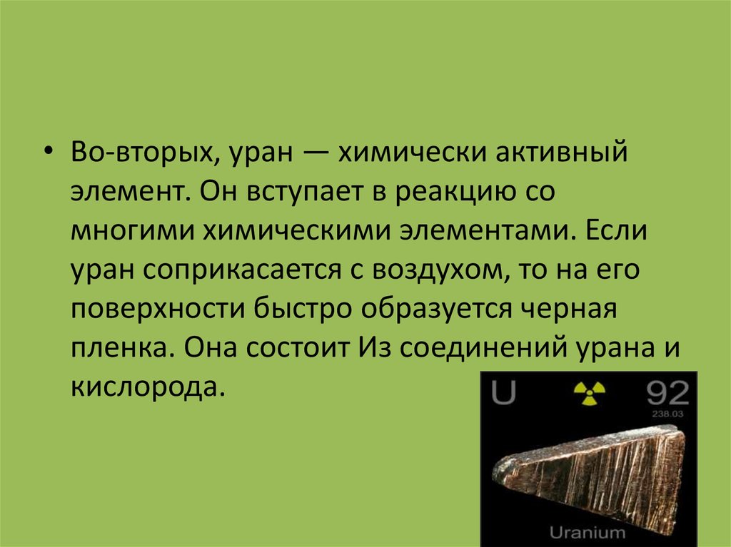 • Во-вторых, уран — химически активныйэлемент. Он вступает в реакцию со