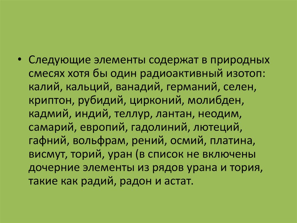 • Следующие элементы содержат в природныхсмесях хотя бы один радиоактивный изотоп:
