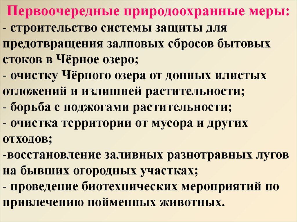Первоочередные природоохранные меры:- строительство системы защиты для