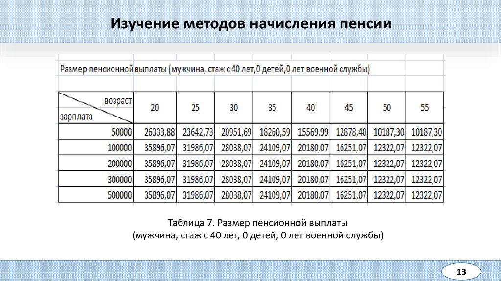 Изучение методов начисления пенсииТаблица 7. Размер пенсионной выплаты