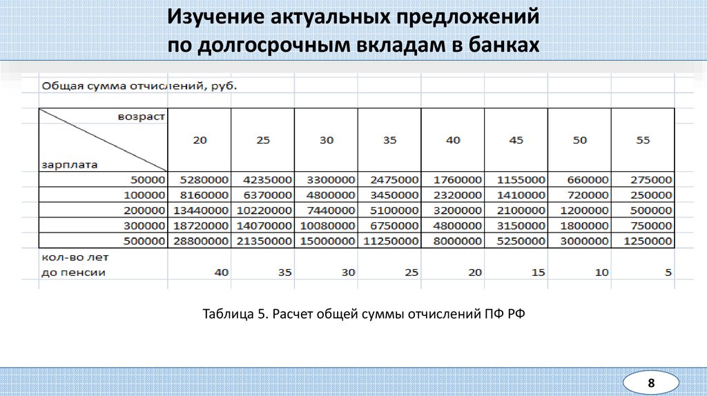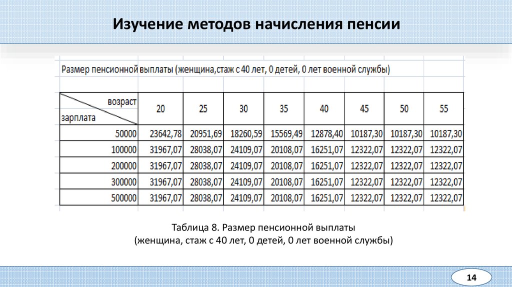 Изучение методов начисления пенсииТаблица 8. Размер пенсионной выплаты