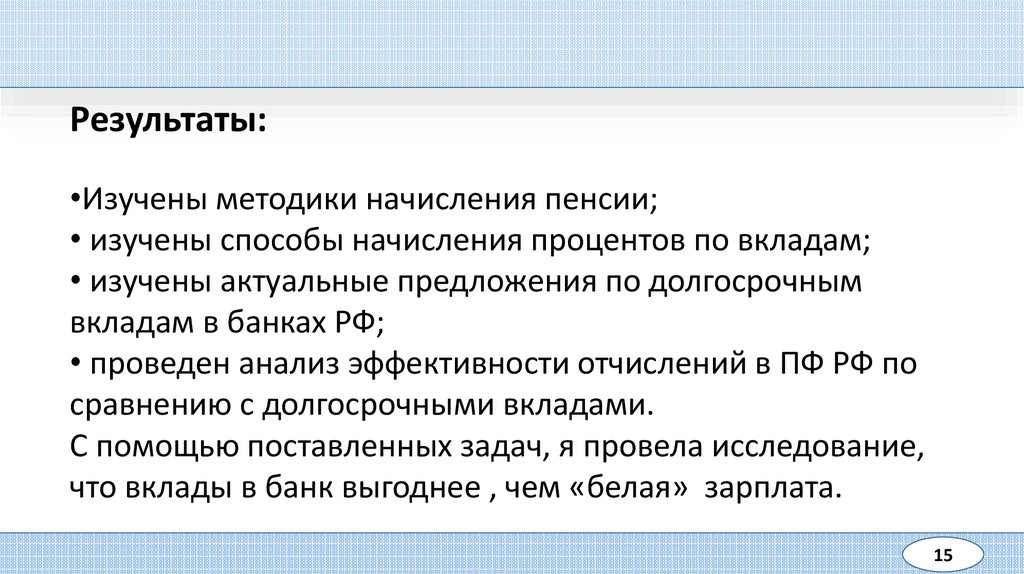 Результаты:•Изучены методики начисления пенсии;