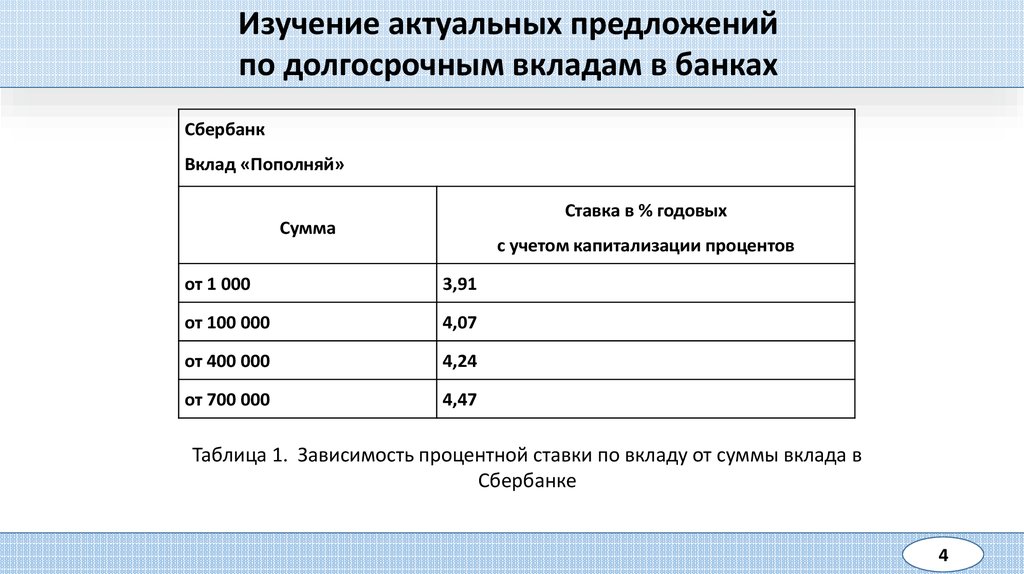 Таблица 1. Зависимость процентной ставки по вкладу от суммы вклада в