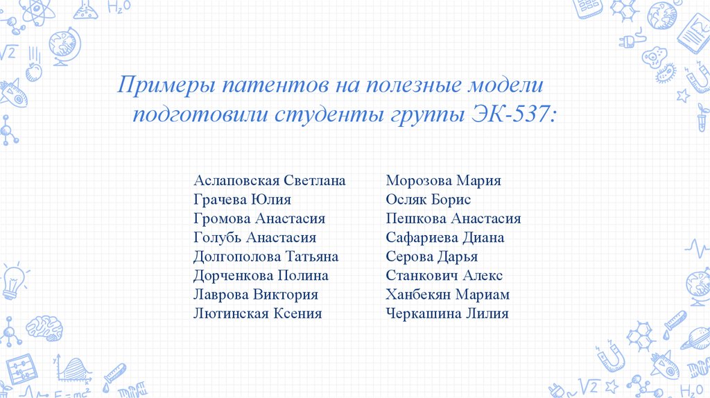 Примеры патентов на полезные моделиподготовили студенты группы ЭК-537: