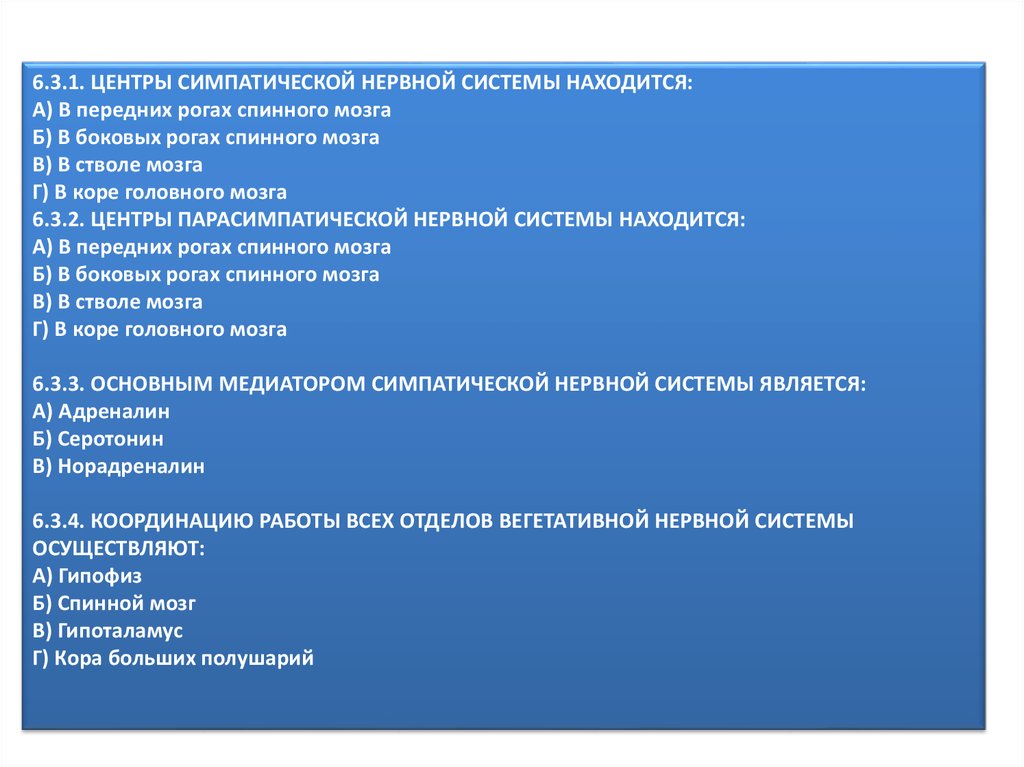 6.3.4. КООРДИНАЦИЮ РАБОТЫ ВСЕХ ОТДЕЛОВ ВЕГЕТАТИВНОЙ НЕРВНОЙ СИСТЕМЫ