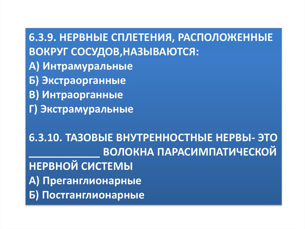 6.3.9. НЕРВНЫЕ СПЛЕТЕНИЯ, РАСПОЛОЖЕННЫЕВОКРУГ СОСУДОВ,НАЗЫВАЮТСЯ: