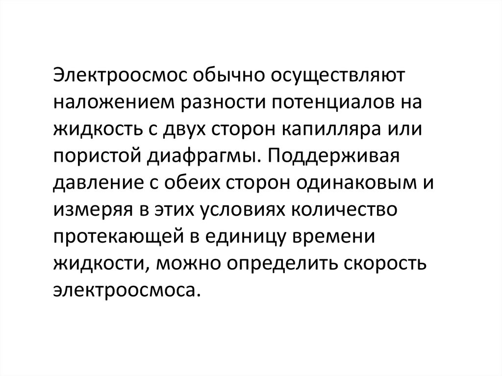 Электроосмос обычно осуществляютналожением разности потенциалов на
