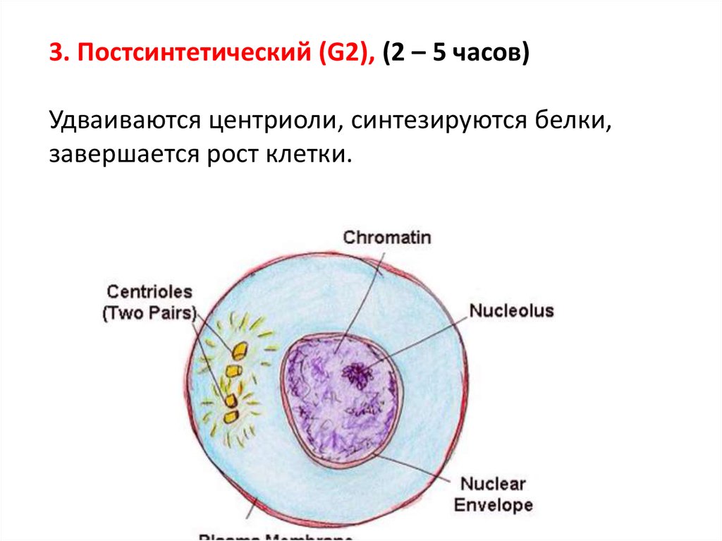 3. Постсинтетический (G2), (2 – 5 часов)Удваиваются центриоли, синтезируются белки,