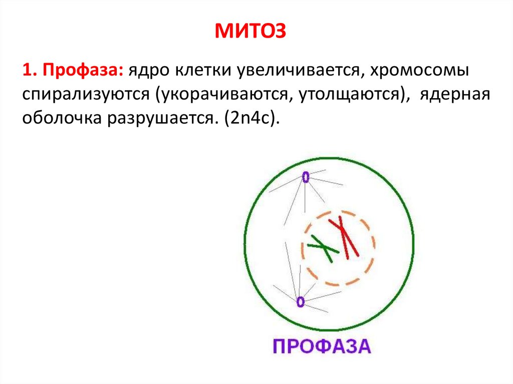МИТОЗ1. Профаза: ядро клетки увеличивается, хромосомы