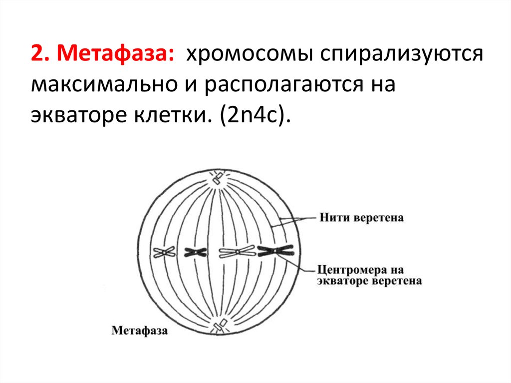 2. Метафаза: хромосомы спирализуютсямаксимально и располагаются на