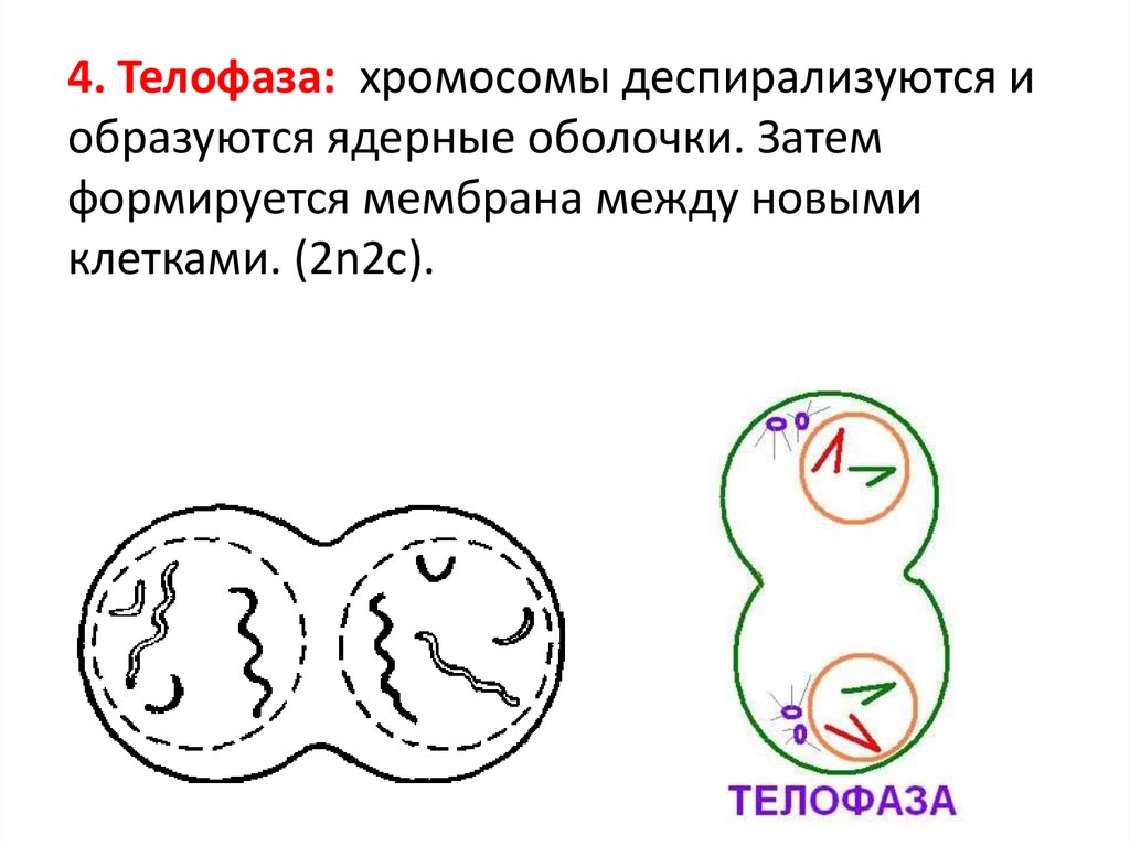 4. Телофаза: хромосомы деспирализуются иобразуются ядерные оболочки. Затем