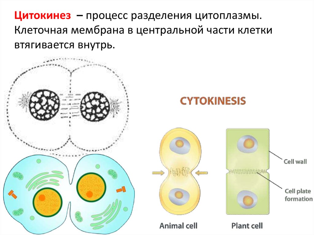 Цитокинез – процесс разделения цитоплазмы.Клеточная мембрана в центральной части клетки