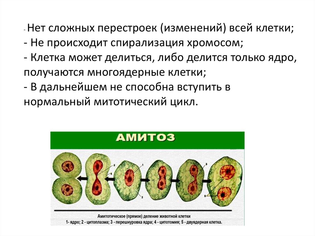 Нет сложных перестроек (изменений) всей клетки;- Не происходит спирализация хромосом;