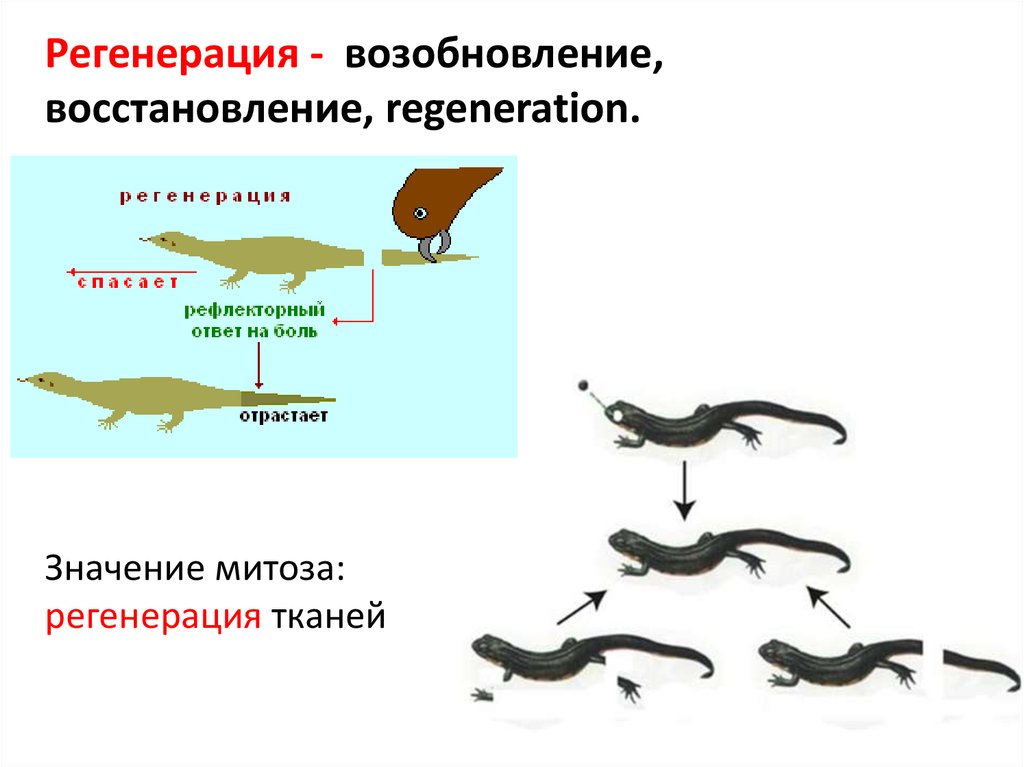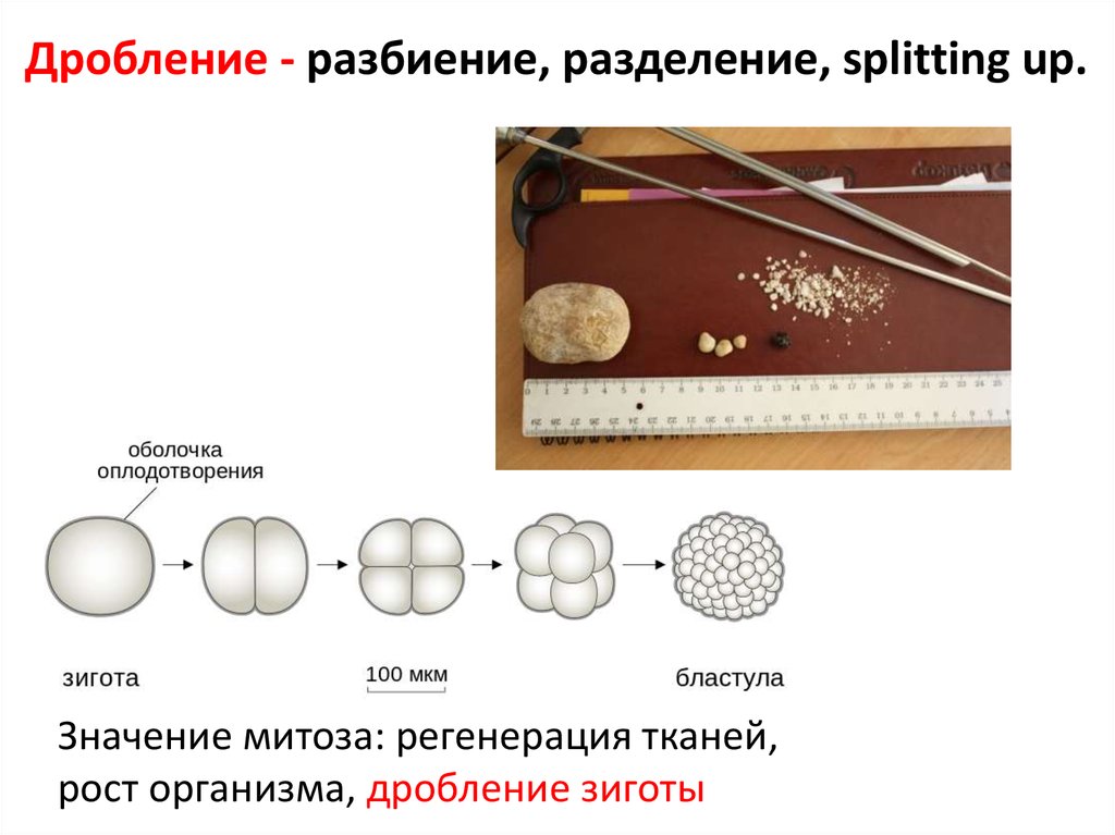 Дробление - разбиение, разделение, splitting up.Значение митоза: регенерация тканей,
