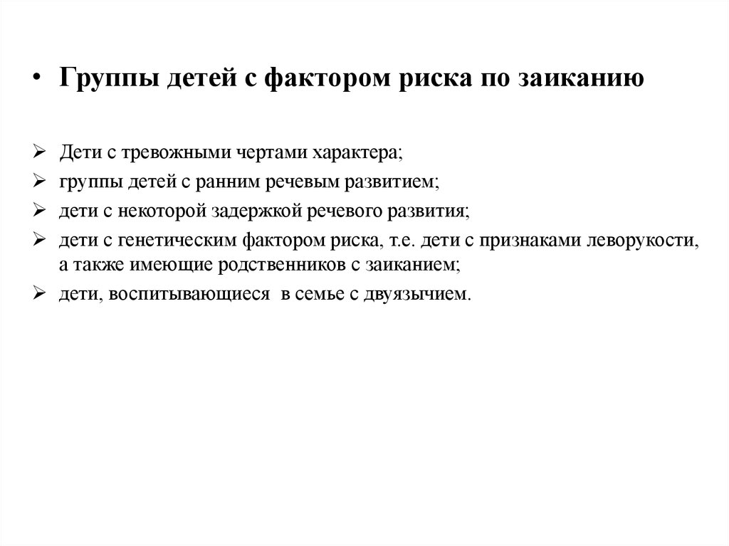 • Группы детей с фактором риска по заиканиюДети с тревожными чертами характера;