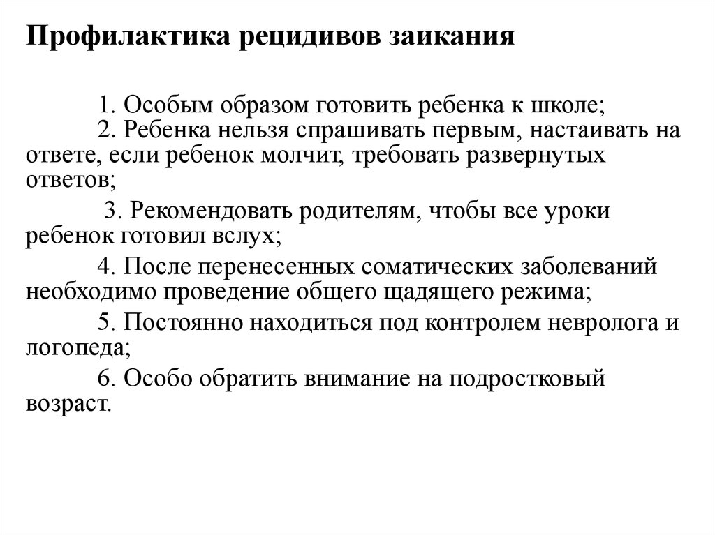 Профилактика рецидивов заикания1. Особым образом готовить ребенка к школе;