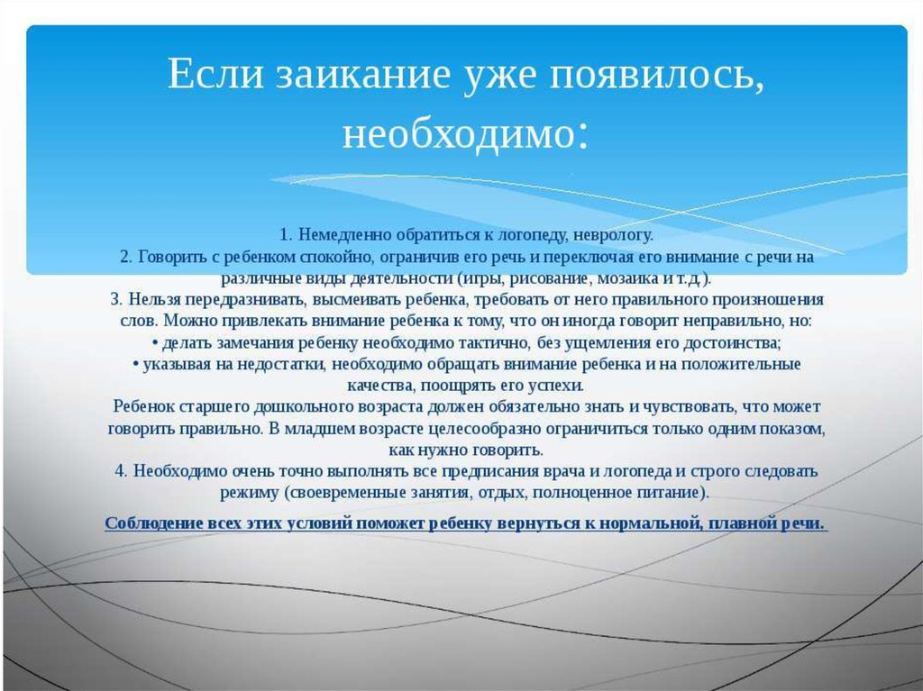 • Если заикание уже появилось, необходимо(профилактика хронификации заикания):