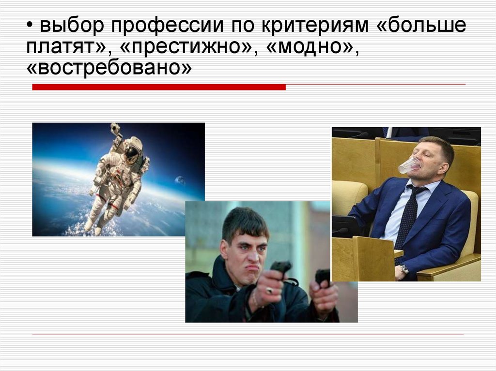 • выбор профессии по критериям «большеплатят», «престижно», «модно»,