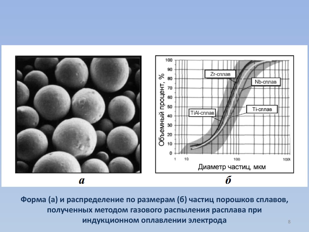 Форма (а) и распределение по размерам (б) частиц порошков сплавов,полученных методом газового распыления расплава при