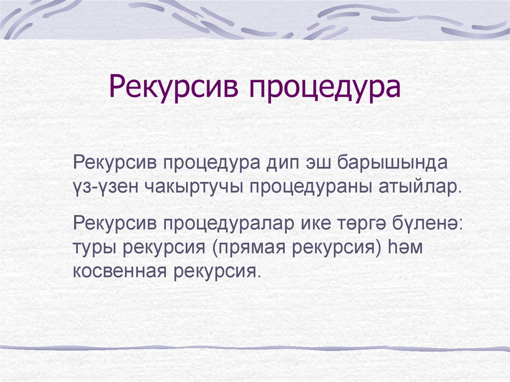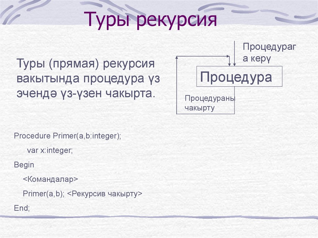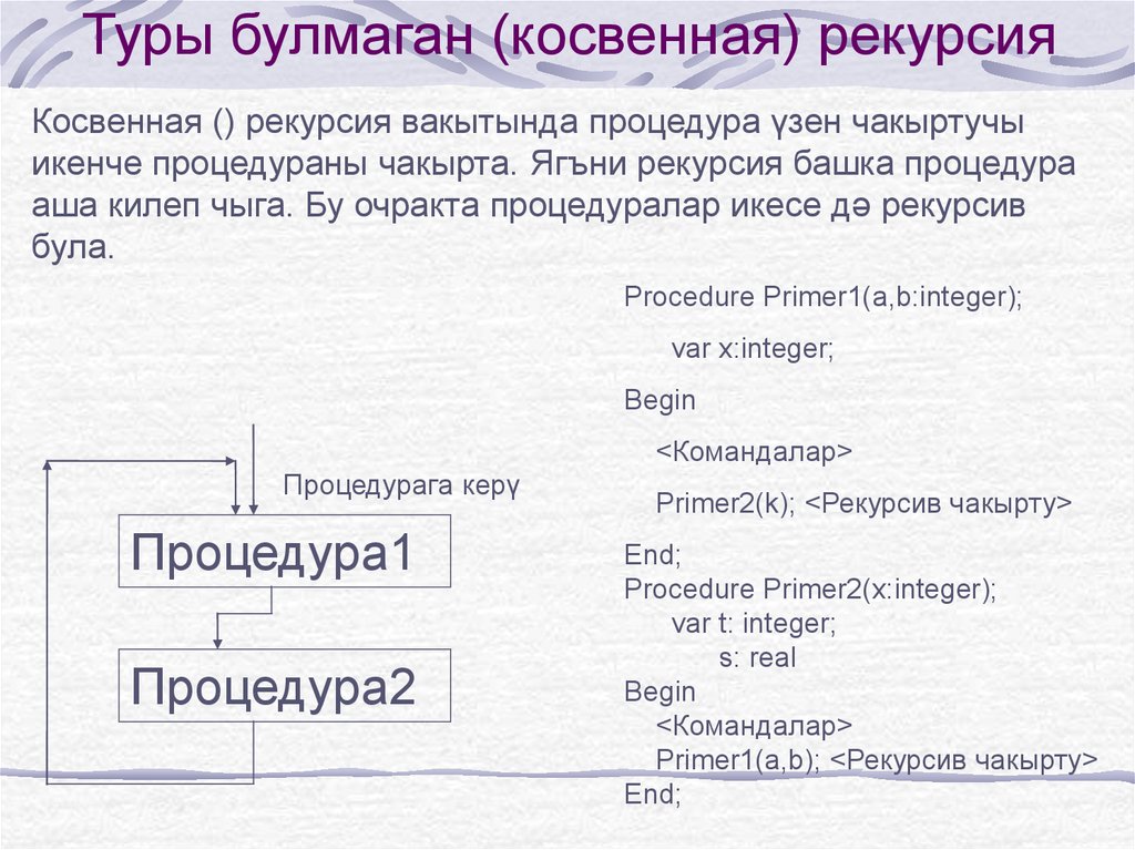 Туры булмаган (косвенная) рекурсияКосвенная () рекурсия вакытында процедура үзен чакыртучы