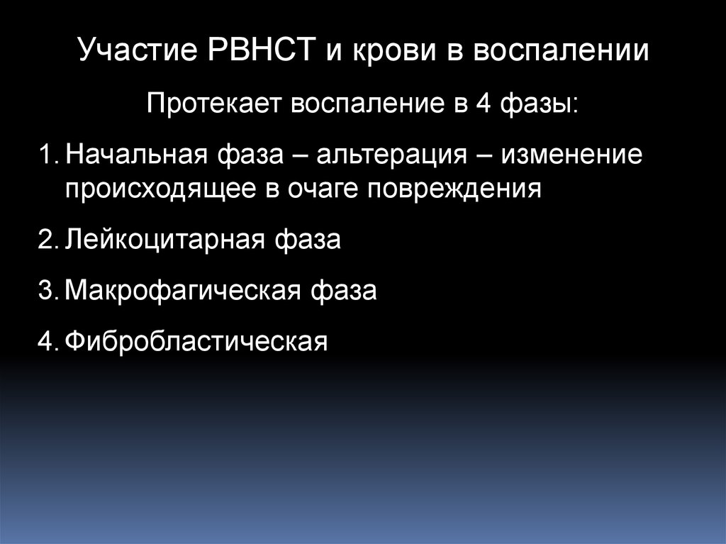 Участие РВНСТ и крови в воспаленииПротекает воспаление в 4 фазы: