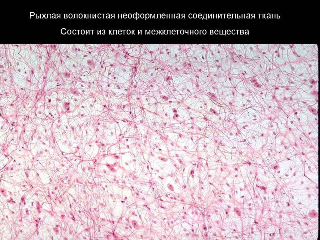 Рыхлая волокнистая неоформленная соединительная тканьСостоит из клеток и межклеточного вещества