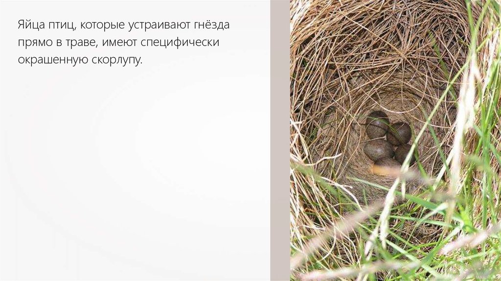 Яйца птиц, которые устраивают гнёздапрямо в траве, имеют специфически